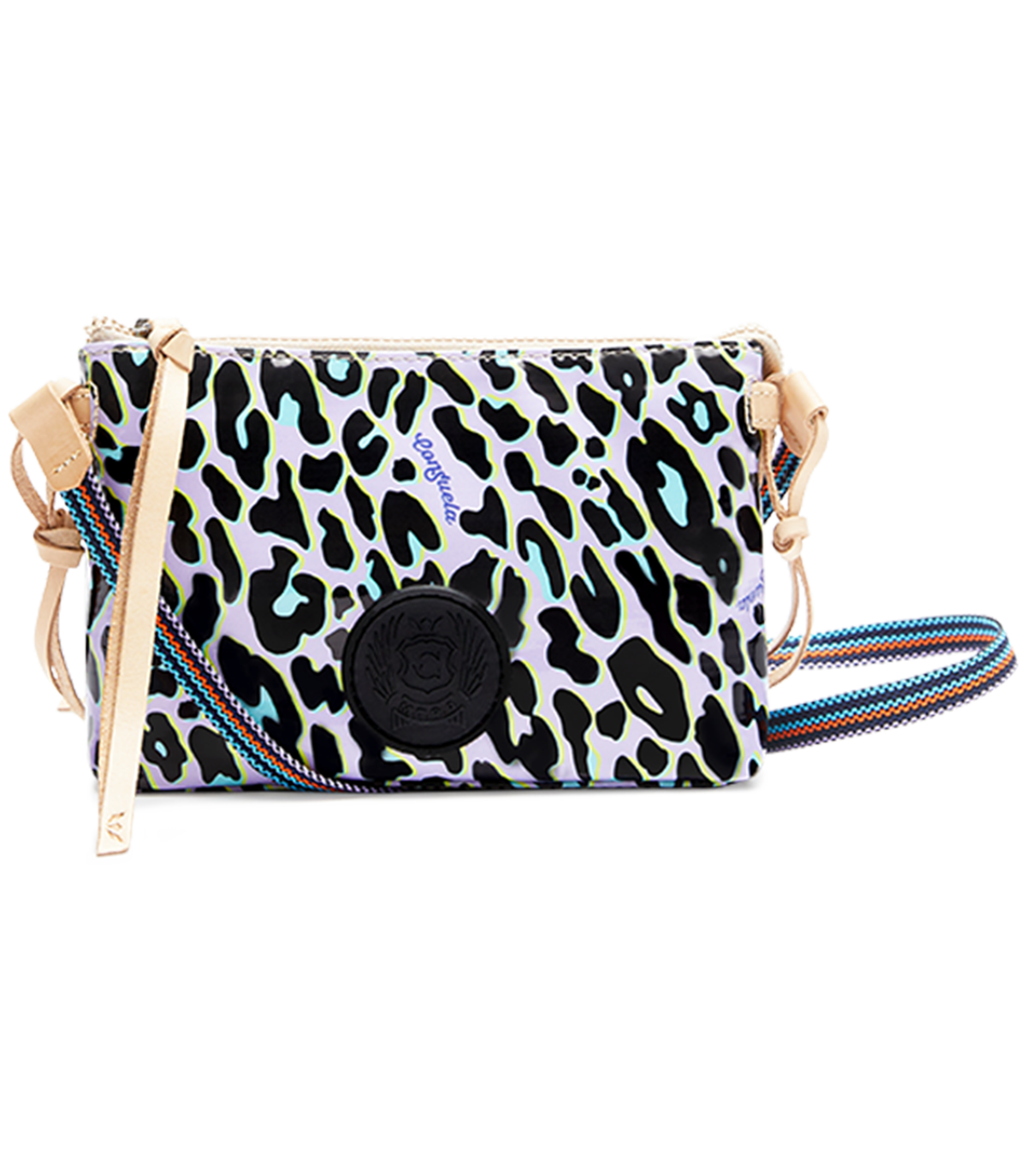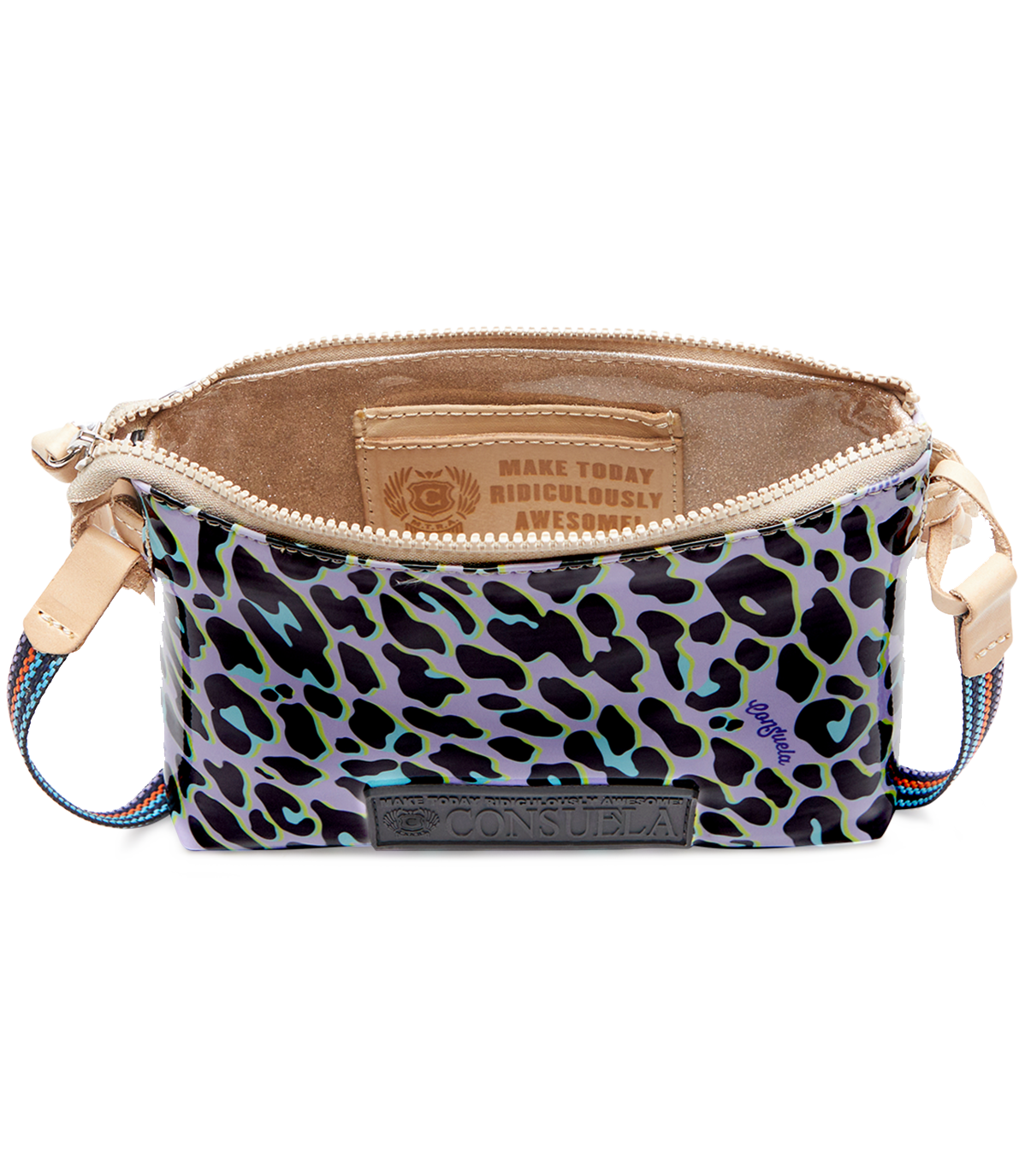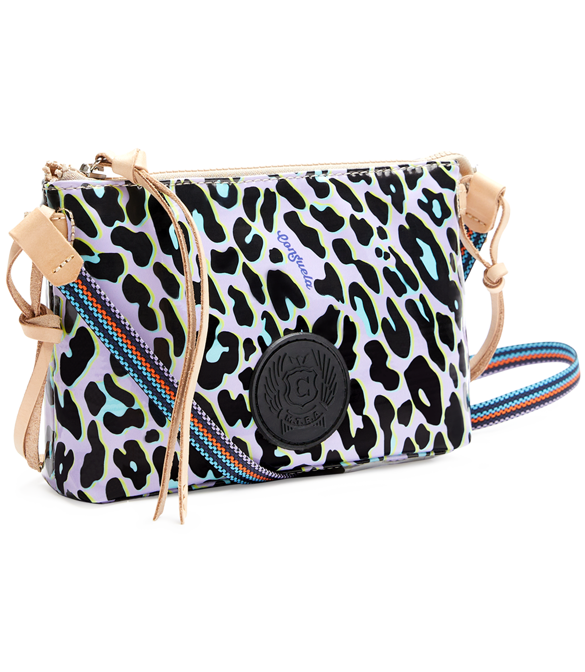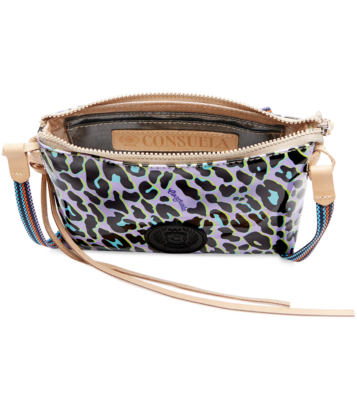 • Woven crossbody strap with natural, untreated leather trim