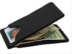 Our all-leather money clip securely holds all your bills and credit cards. Its sleek look makes it easy to carry in your pocket or in a purse.