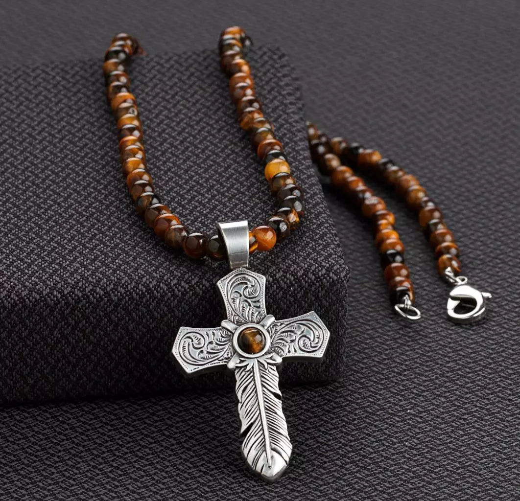 Silver Strike Tiger Eye Beaded Necklace With Cross Pendent - D47012