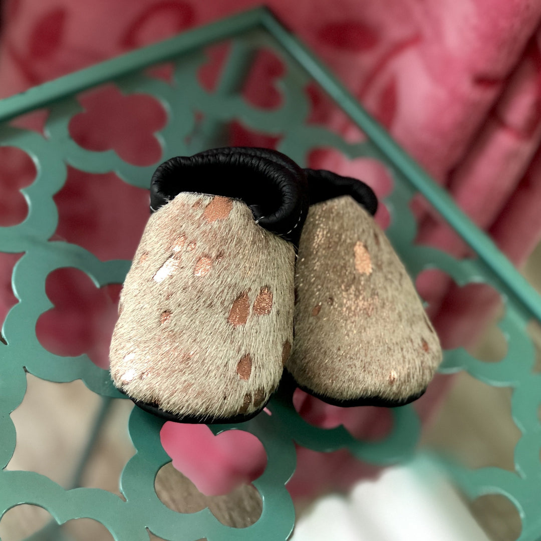 Cowhide Baby Girl Mocs with Rose Pink Acid Wash