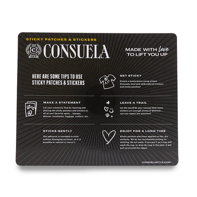 Consuela Stickers are here to bring energy and inspiration, whether they’re applied to journals, laptop cases, Consuela Notebook covers, suitcases, or straight to the fridge. Stick to what you love!