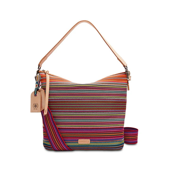 The Hobo is a convertible crossbody or shoulder bag with two included straps. This multicolored bag comfortably carries the essentials and much more. Perfect for those who like to be prepared for anything and everything!
