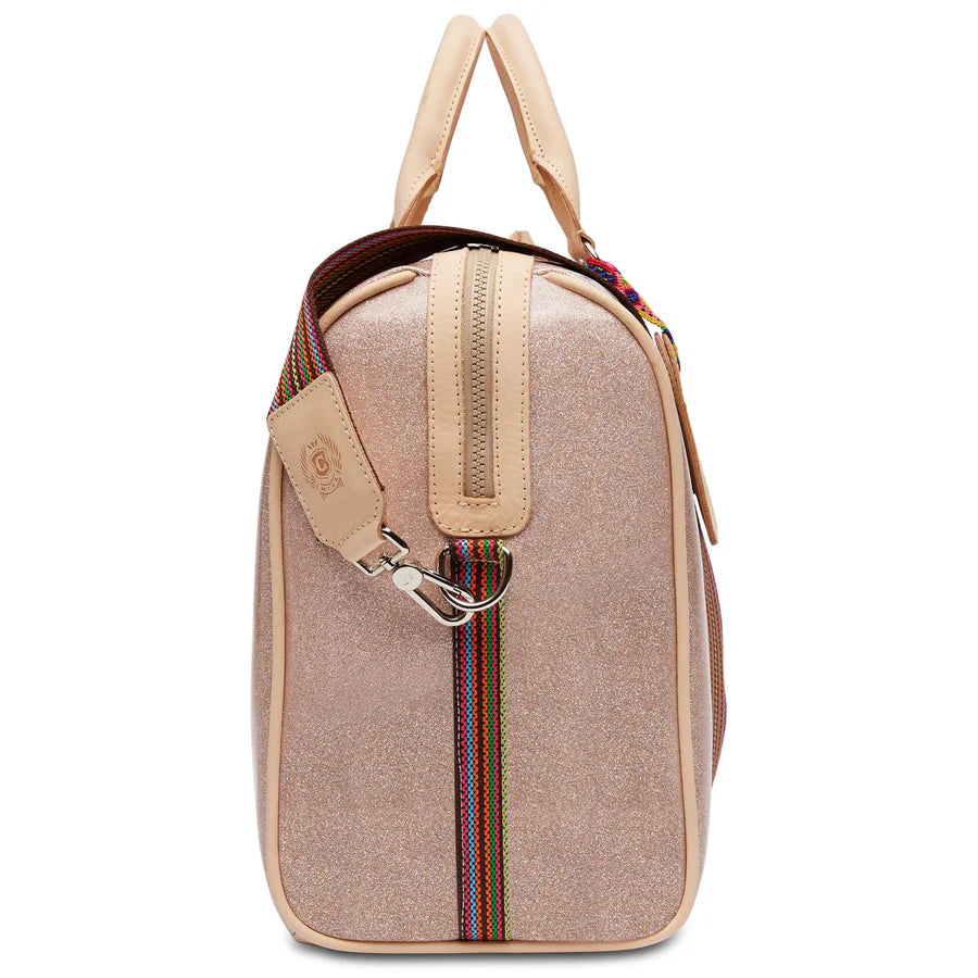 Our Jetsetter ConsuelaCloth™ is our newest weekender style and largest bag. This spacious duffel is the perfect carry-on for a weekend getaway. Topped with natural leather handles and a comfortable, woven shoulder strap, this weekend bag is crafted to hold its shape and makes traveling easy with ample interior storage and functional pockets.