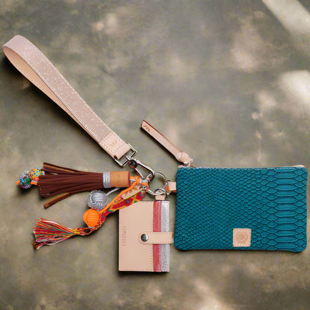 The Combi, a combination of on-the-go accessories, is a new way to carry your keys, cards, and the small stuff together or separately. This embroidered wristlet wallet includes a pocket pouch, secure card slot wallet and fits comfortably around your wrist.