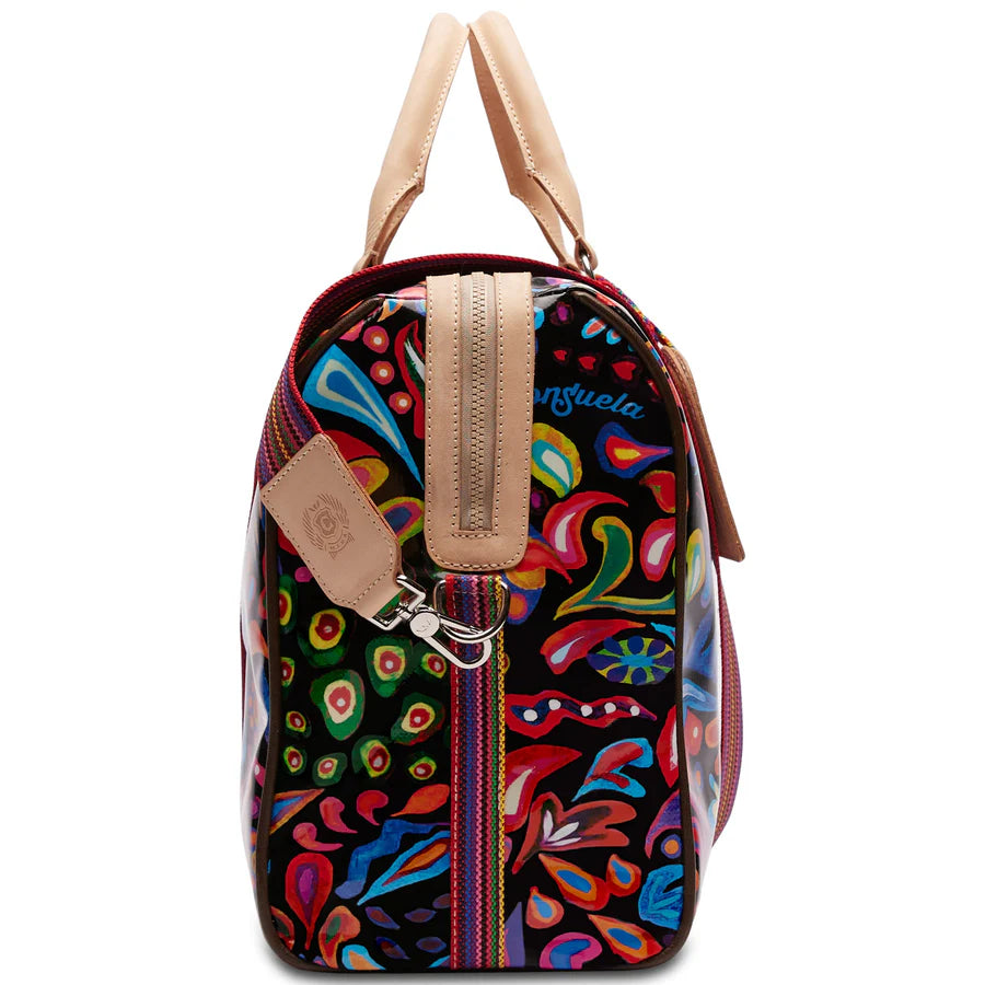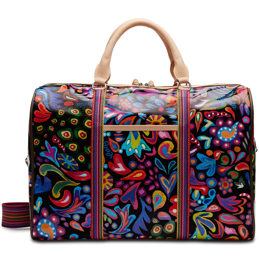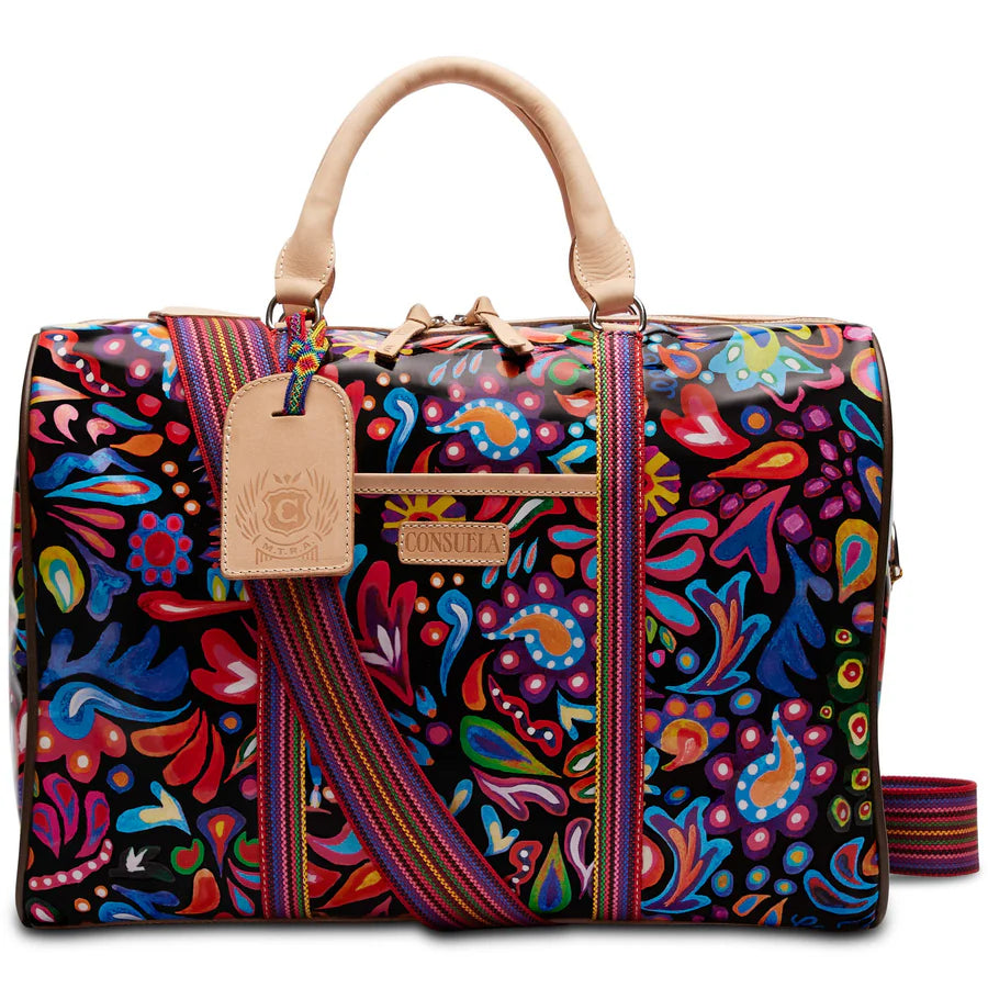 Our Jetsetter ConsuelaCloth™ is our newest weekender style and largest bag. This spacious duffel is the perfect carry-on for a weekend getaway. Topped with natural leather handles and a comfortable, woven shoulder strap, this weekend bag is crafted to hold its shape and makes traveling easy with ample interior storage and functional pockets.