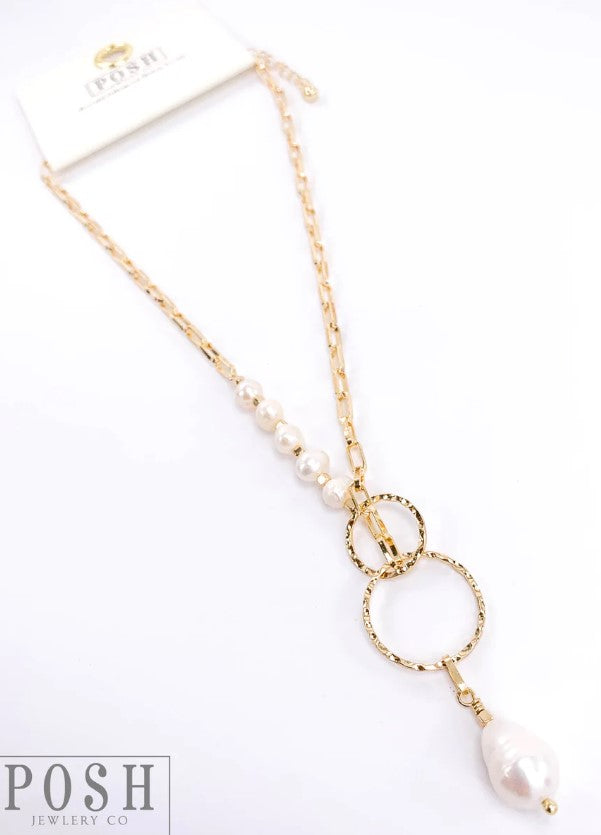 9PN120 Paperclip chain and pearl necklace with rings and large pearl drop (2 colors)