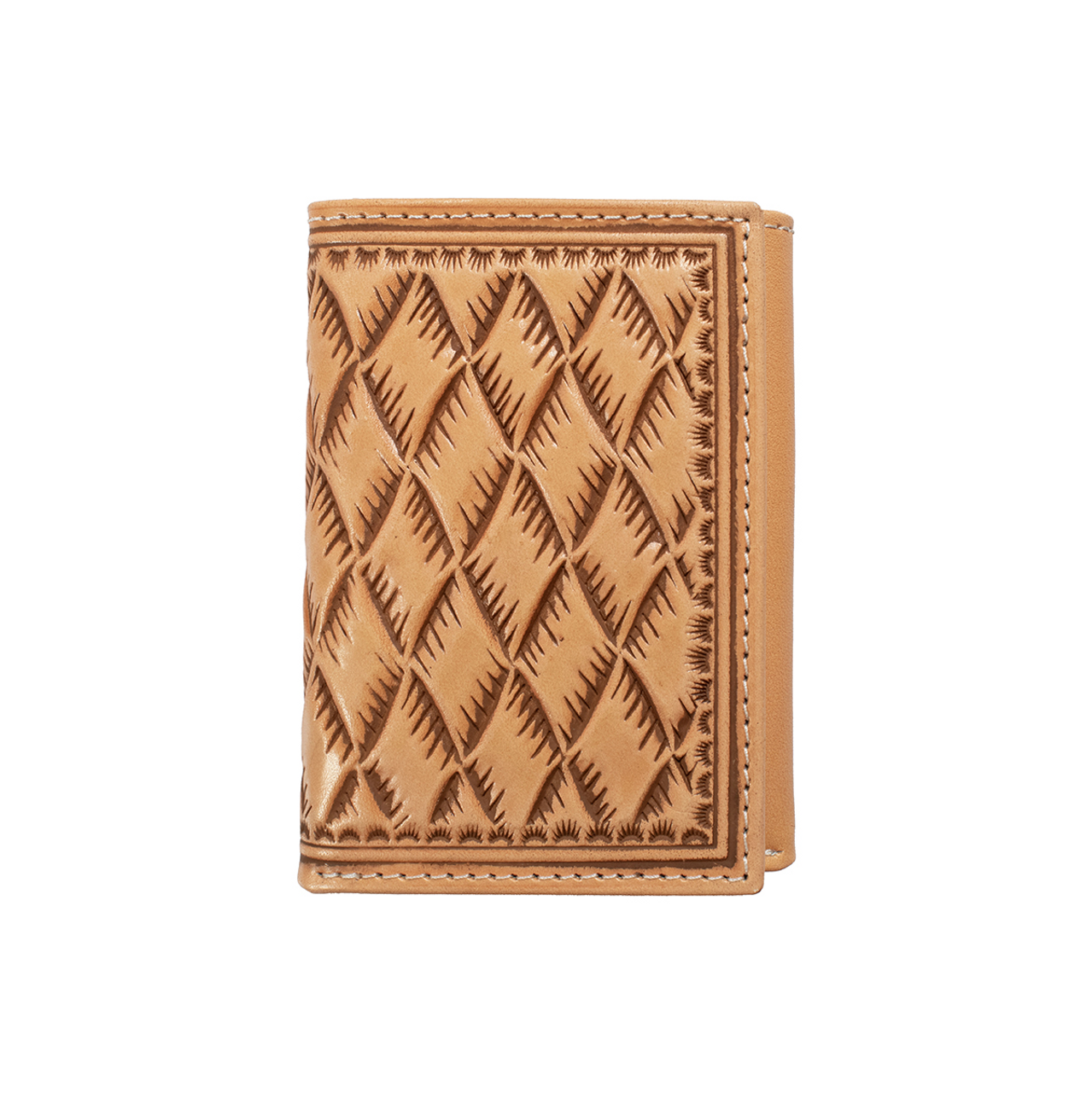 This Nocona trifold wallet by M&F Western Products has natural leather body with large basket weave embossing on the front. Multiple card slots, cash slot and ID window on the inside.