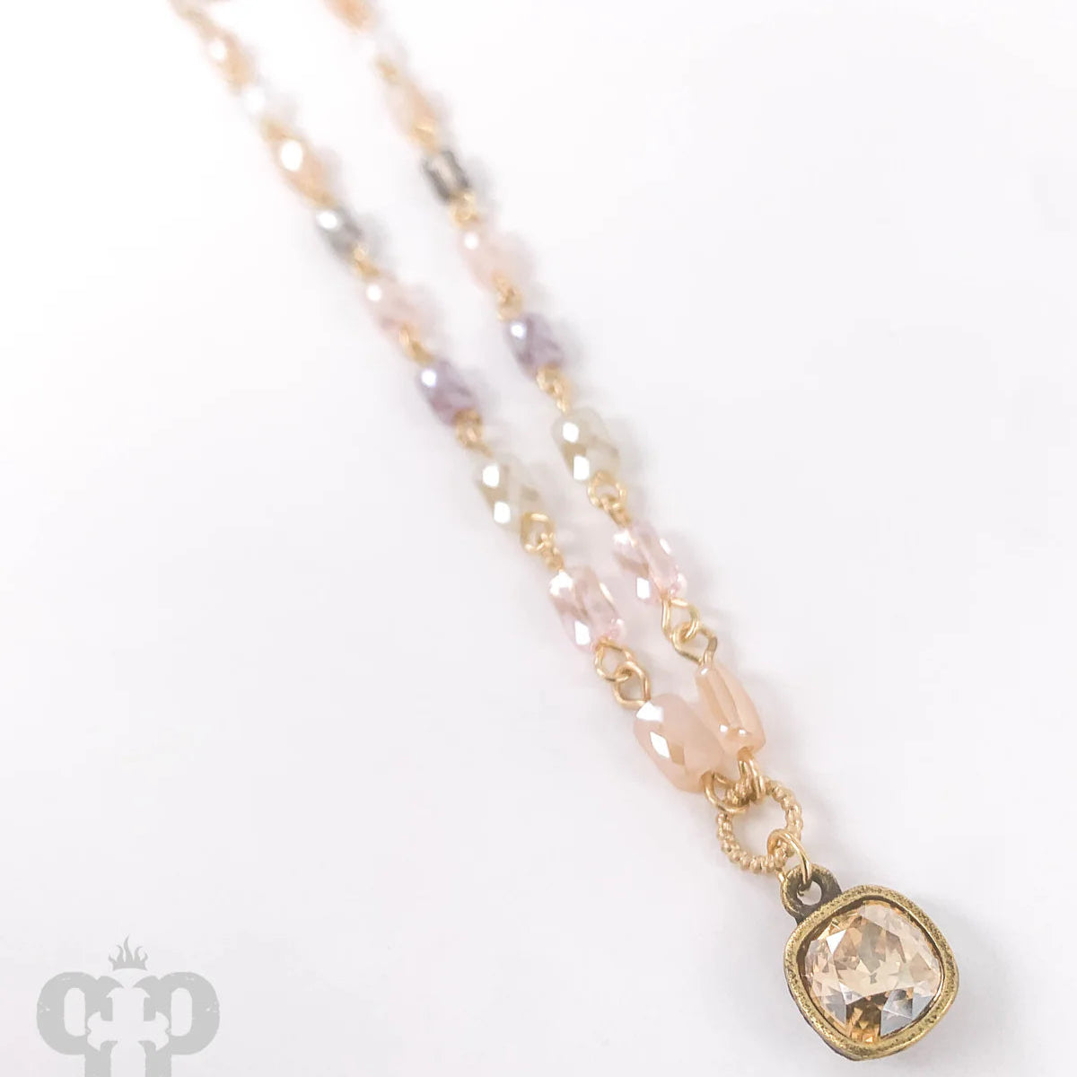 This necklace features tube beads, gold chain and an 8mm Austrian crystal cushion cut drop.  Approximately 17 inches in length with an extender chain.