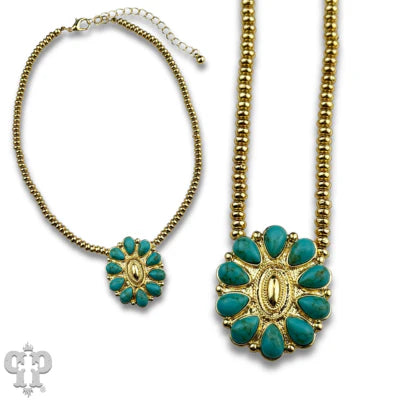 This choker necklace has a single strand of 18k gold dipped saucer beads. The 18k gold dipped concho has Turquoise teardrop cabochons and is strung onto the necklace. It has a lobster clasp and 3" extender chain.