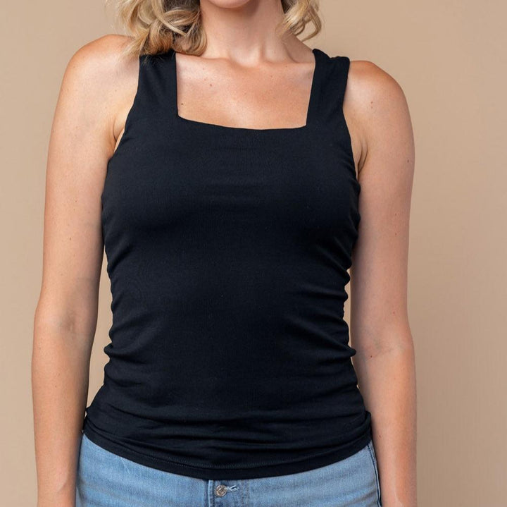 A sleeveless solid knit top with a square neck featuring a
